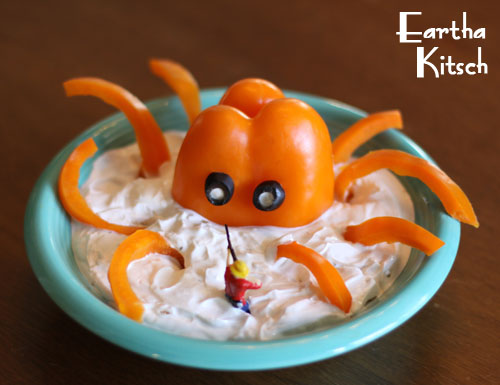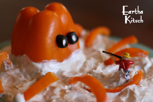 One tip that we learned too late is that it's best to incorporate the butt of the pepper when cutting the strips for tentacles so that there is more curve to them. Also, a larger platter works best to make things look more realistic. If I ever made this for a party, I'd probably use a horizontal platter like they used on the original one and give more room for a sunken boat. Because when you're making wacky food, you can't get
