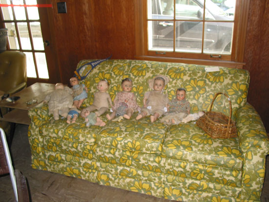 Floral sofa in the basement. Check out the doll society and the original VCT tiles.