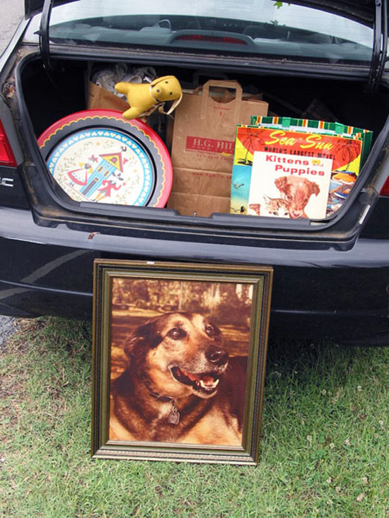 She told us his name and about how he was such a sweet dog. I always feel like a bit of a freak show when I buy other peoples' family portraits in front of them but she seemed pleased when I promised that I'd treasure him. Or maybe she just wanted me off of her porch. You know how sometimes it's hard to tell? Thank goodness I didn't prattle on about how I'd treasure the vintage litter box that I bought.